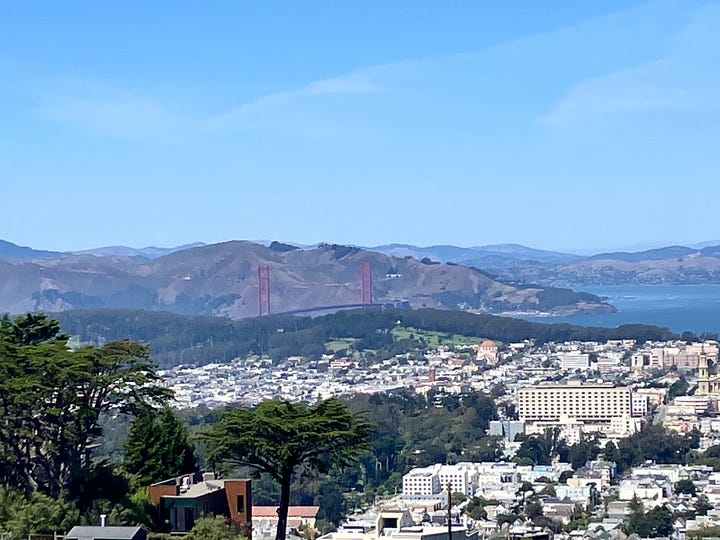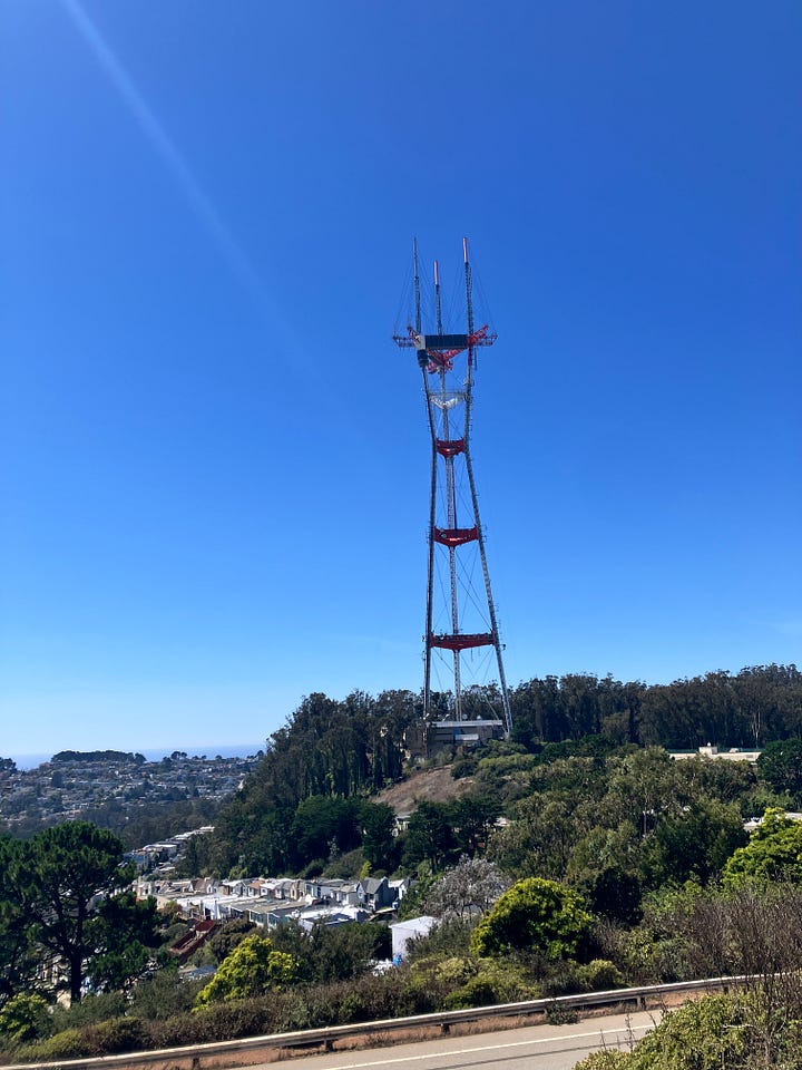 But today, it was bright and sunny, offering incredible views of the entire Bay Area - Mount Diablo and the Golden Gate Bridge and the cargo ships floating in the Bay. Families and couples were out, doing photo shoots with the sweeping views as a perfect backdrop. Luckily the Double Cross does not force you to go to the tippy-top of the Twin Peaks — we got to stick to the broad road, closed to cars.