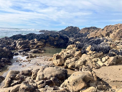 We hiked through the rocks to the sandy beach. Unlike Pomponio, Pescadero’s beach and waters were strewn with large rock formations, which the waves dramatically crashed against. We walked up to a group of rocks that looked black on top. What I had thought was discoloration turned out on closer inspection to be thousands of California mussels. The mussels cling to the rocks in the intertidal zone, spending part of their day above water and part below.