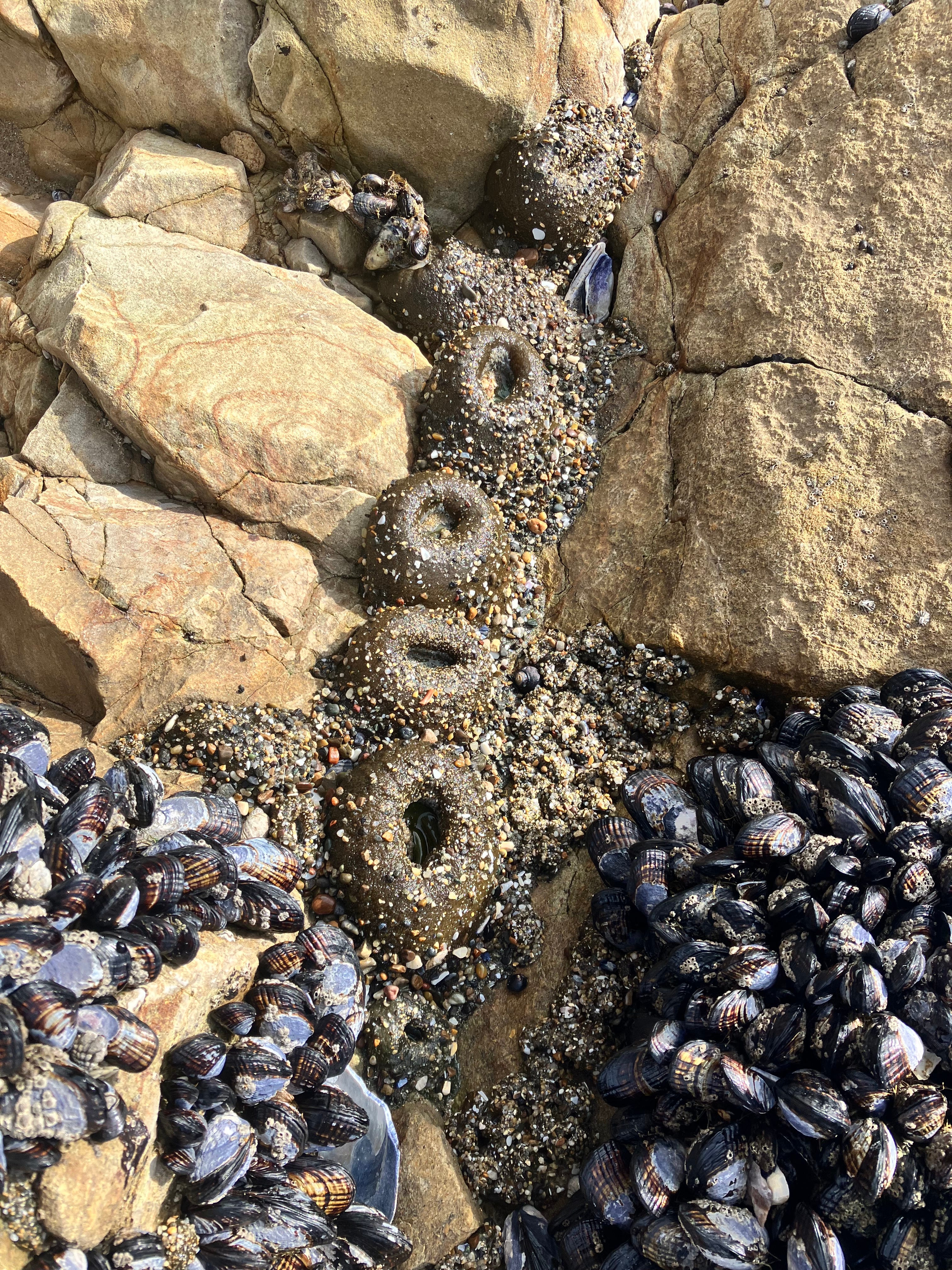 Next to a clump of mussels were what looked like chocolate donuts, covered in sand. But the hole of the “donut” moved in a startling and creepy way. These donuts were creatures - some sort of sea anemone.