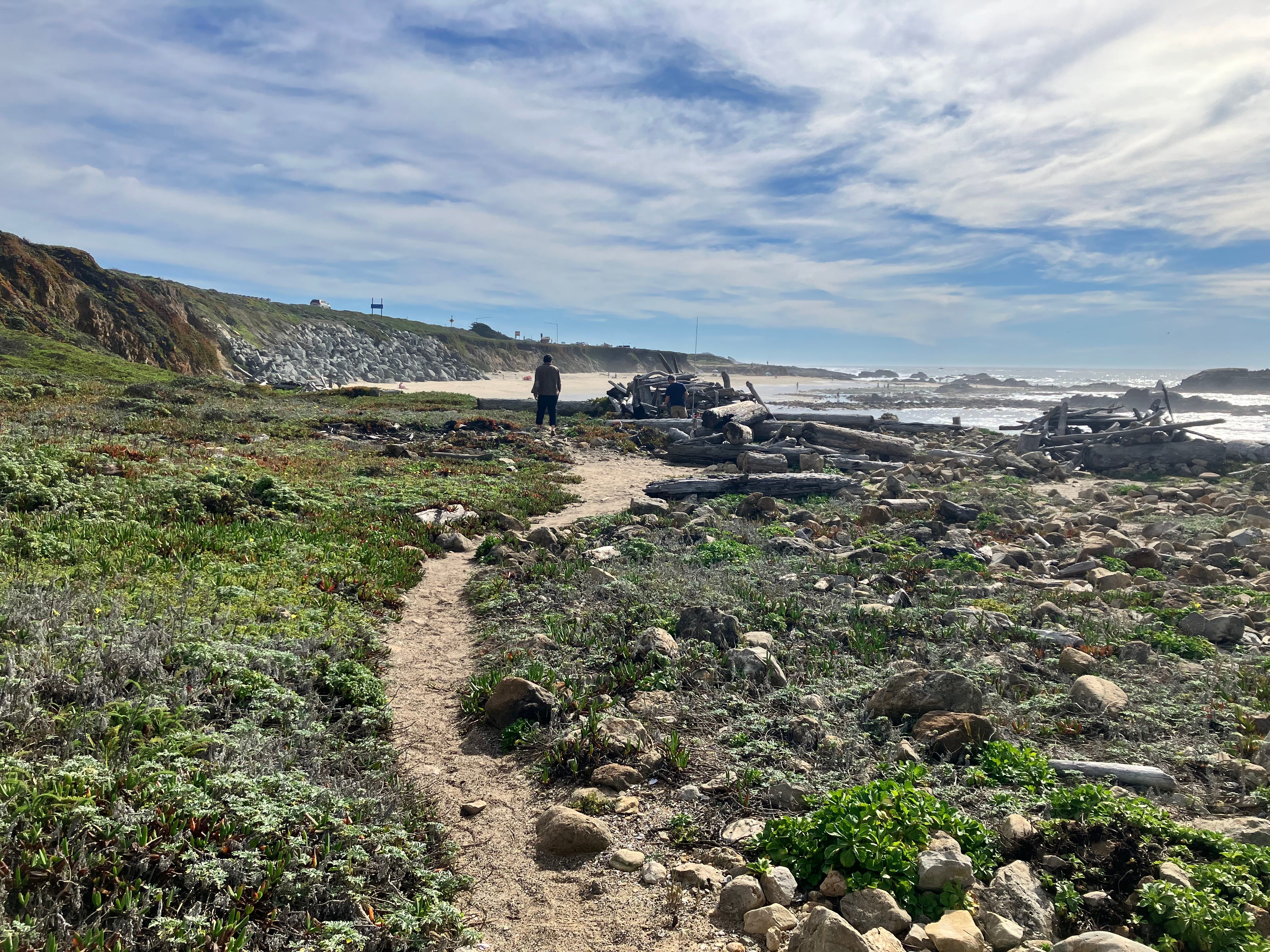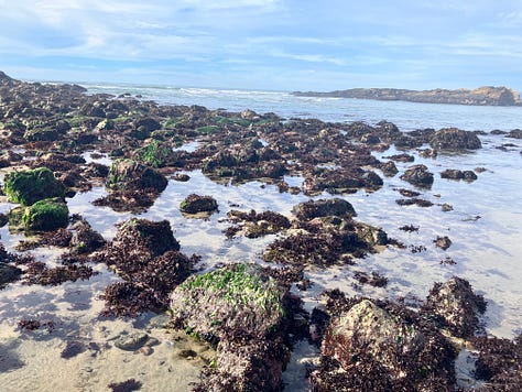 We moved on along the coast, marveling at the strange plants and creatures clinging to the rocks and lurking in the tide pools. I learned later that this stretch of coast is famous for its tide pools; the rock formations are perfect for creating little protected waters and the biodiversity in them is immense. It wasn’t the right time of day for tide pooling, but I still spotted snails and (dead) crabs and kelp and sea lettuces and Torrey’s surfgrass and a species of algae called green rope.