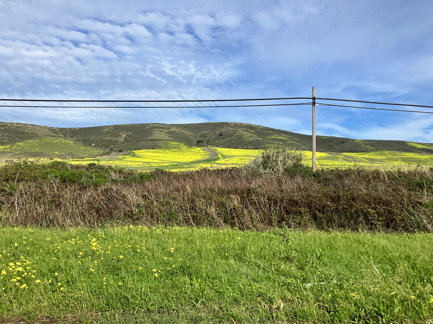 Yesterday was different. Only a whisper of a breeze and strong, bright sunshine. We headed south down Highway 1, past coastal hills and marshes and scrubland blooming with flowers. Entire fields turned yellow with mustard and buttercup and the aptly-named California Goldfield flowers. It’s the time of year when everything is in bloom — orange California poppies spilling out of sidewalk cracks and magnolias dripping off trees and camellias bursting through dark green leaves. The hills are lush green, if they aren’t covered in blankets of yellow or purple or orange. It’s exhilarating.